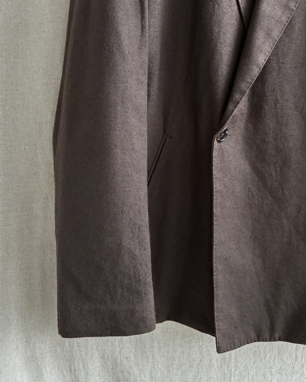 A tailored canvas made from the same fabric is inserted to create a sense of tailored form. Finishings are all crafted by hand.