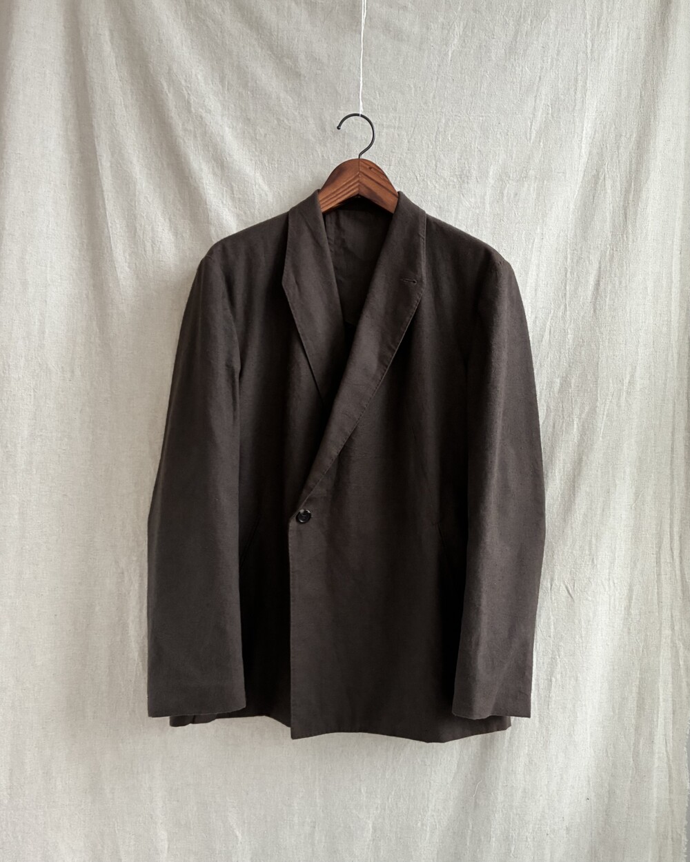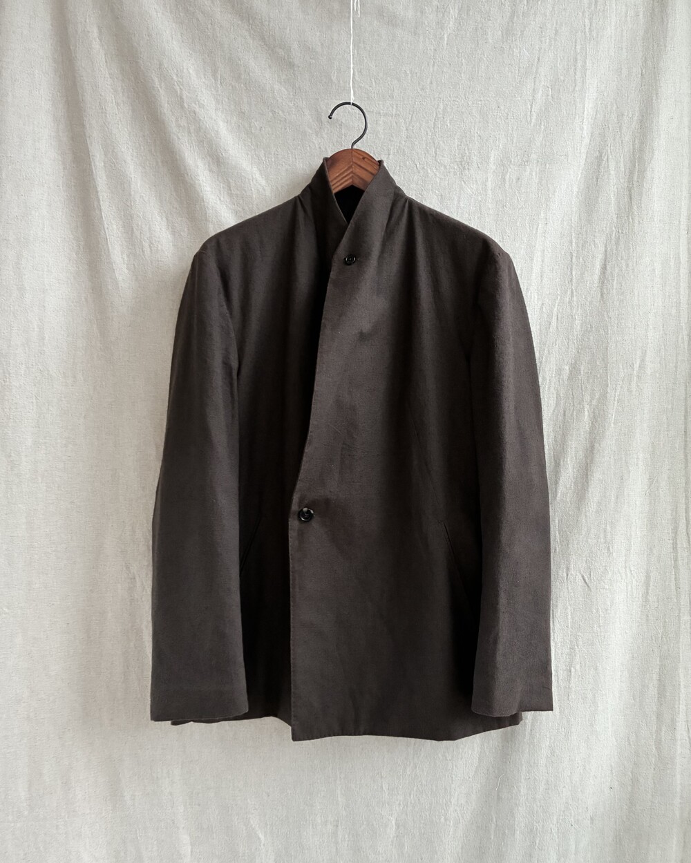 한 장의 몸판이 서로 포개진 구조로 제작된 테일러드 자켓입니다.